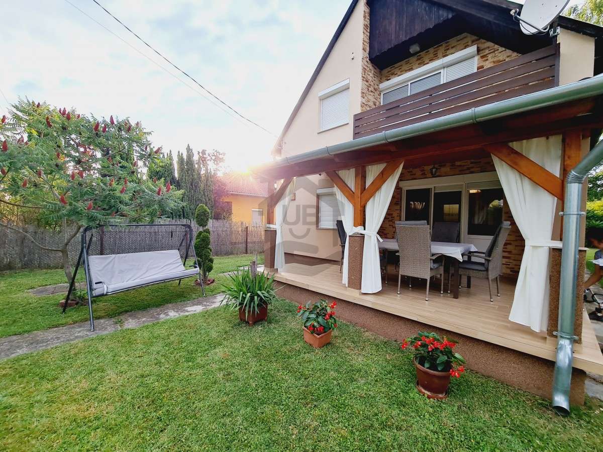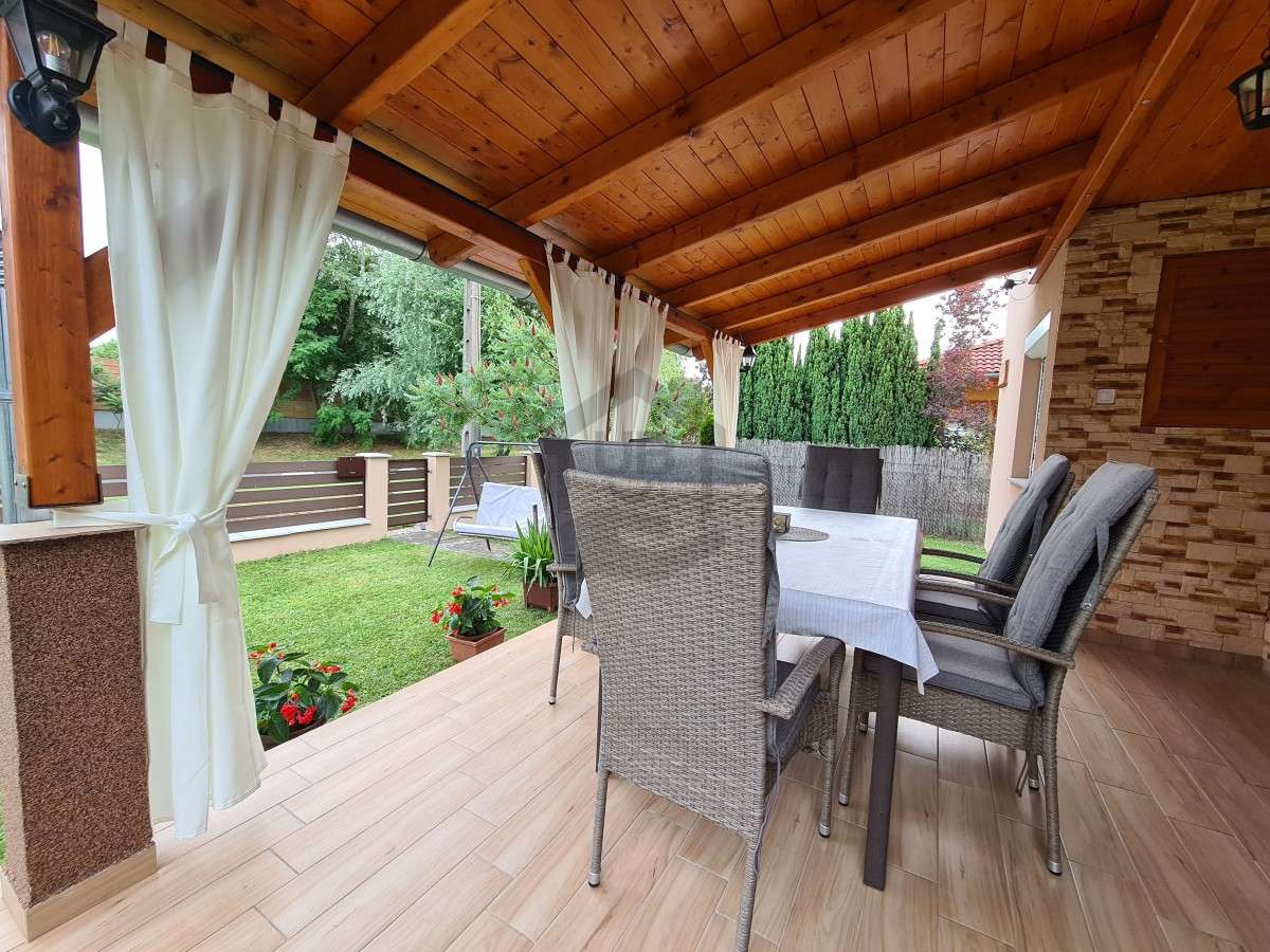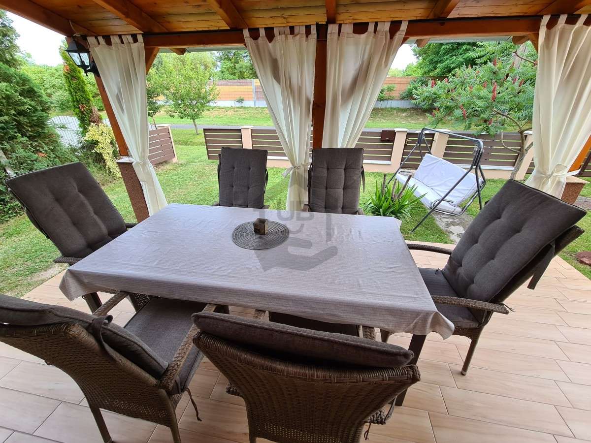 Igényesen berendezett, sok extrával felszerelt, tágas, Balaton-közeli nyaraló medencével, klímával, nagy telekkel, terasz, játszóház, Wi-Fi